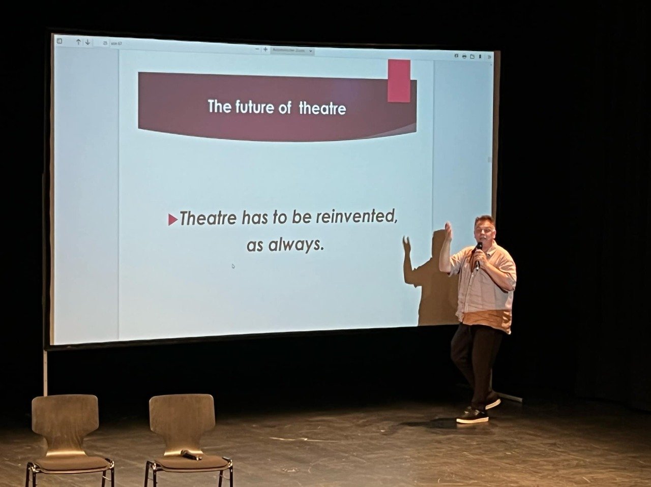 Rodolfo García Vázquez em Berlim ministrando a palestra sobre teatro decolonial. Foto:
