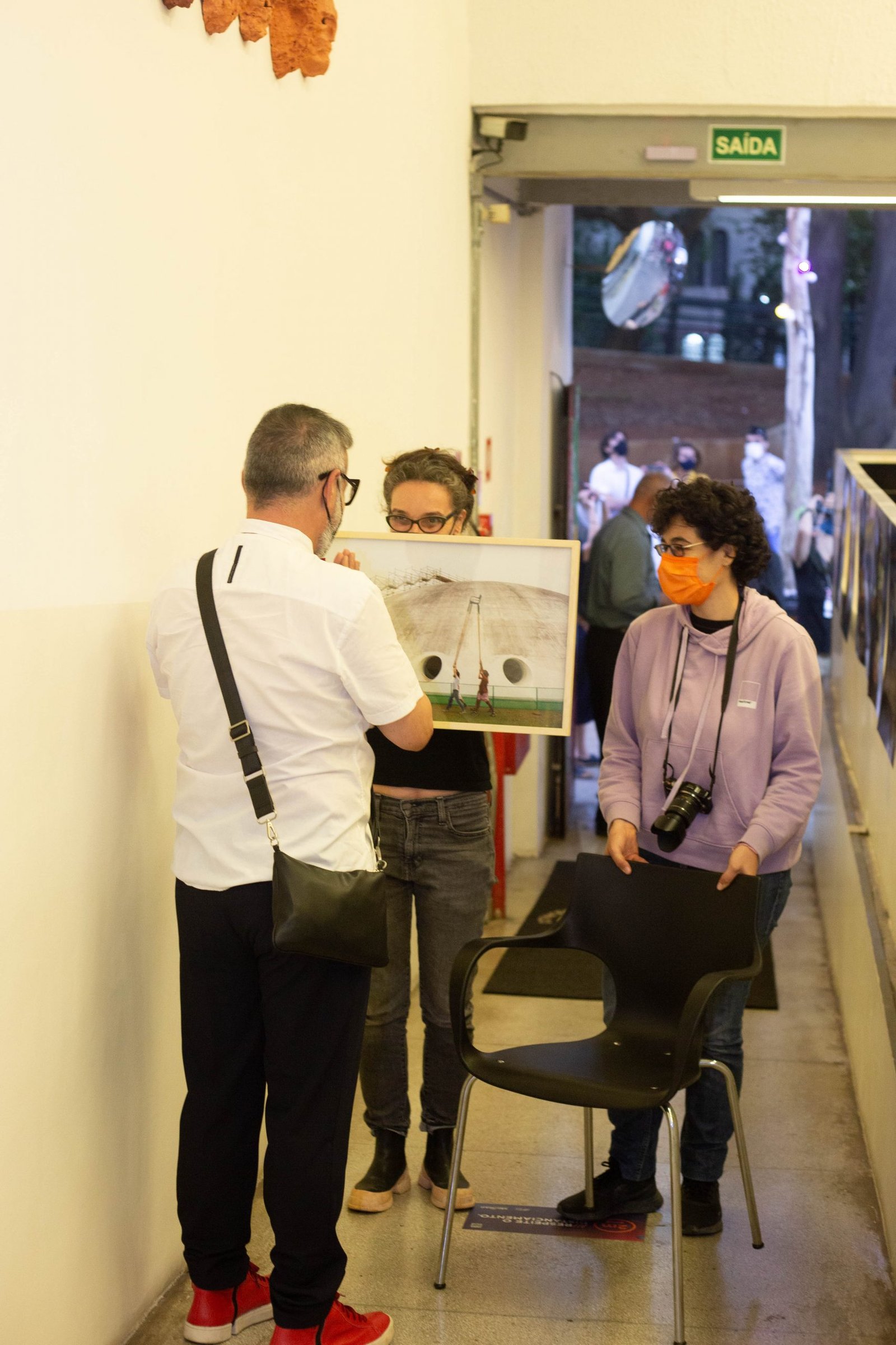Neste último sábado, 4, a artista Eleonora Fabião esteve presente na SP Escola de Teatro para concluir uma das etapas da performance nós aqui, entre o céu e a terra, que teve início em setembro na 34º Bienal de São Paulo. Receberam a artista Ivam Cabral e Joaquim Gama, diretor executivo e coordenador pedagógico da SP Escola de Teatro, respectivamente.