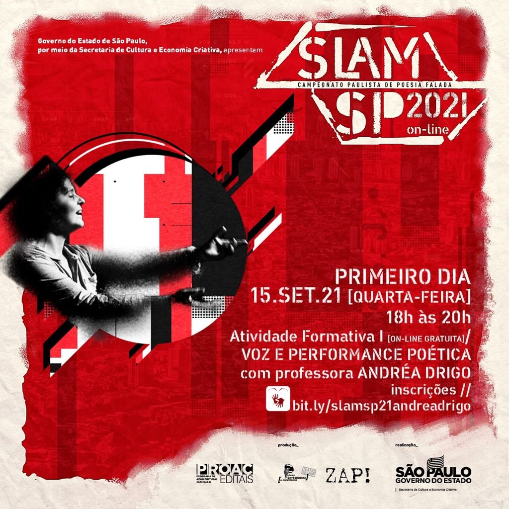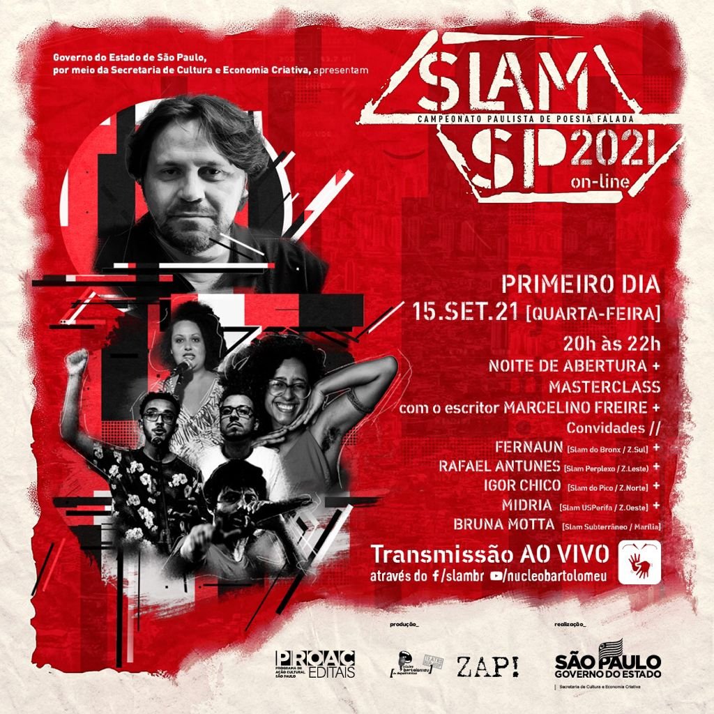 De 15 a 19 de setembro, o Núcleo Bartolomeu de Depoimentos realiza a edição 2021 do campeonato paulista de SLAM – batalhas de poesia falada – valendo vaga para o SLAM BR, que, por sua vez, garantirá ao vencedor participação na Copa América de SLAM de 2021.