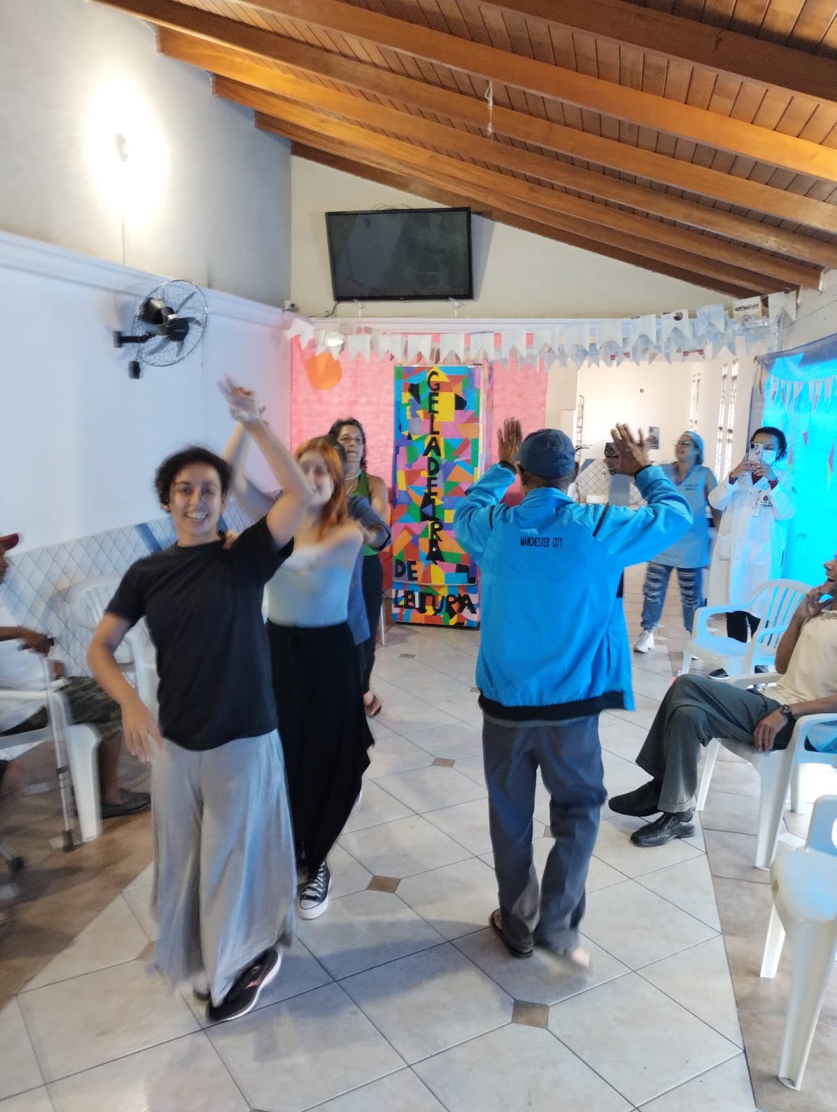 Fotografia colorida dos estudantes da SP Escola de Teatro na atividade de contrapartida no Centro de Acolhida Especial para Idosos do Brás