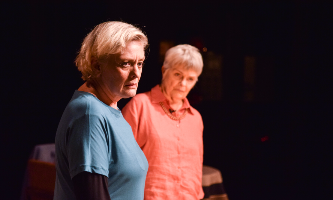 Dois atores em cena, lado a lado, na peça Mãos Trêmulas