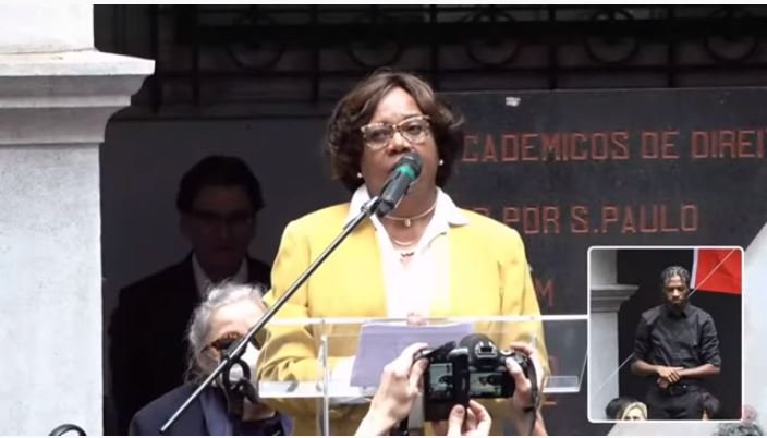 Eunice Prudente, conselheira da ADAAP, lê carta destinada para o povo brasileiro no ato pela democracia na Faculdade de Direito do Largo de São Francisco, da USP