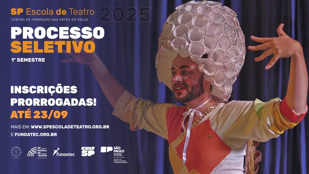 A SP Escola de Teatro – Centro de Formação das Artes do Palco, instituição da Secretaria da Cultura, Economia e Indústria Criativas do Governo de São Paulo, recebe até as 17h de 23 de setembro as inscrições para o seu Processo Seletivo 2025/1, referente às novas turmas que iniciam no primeiro semestre de 2025.