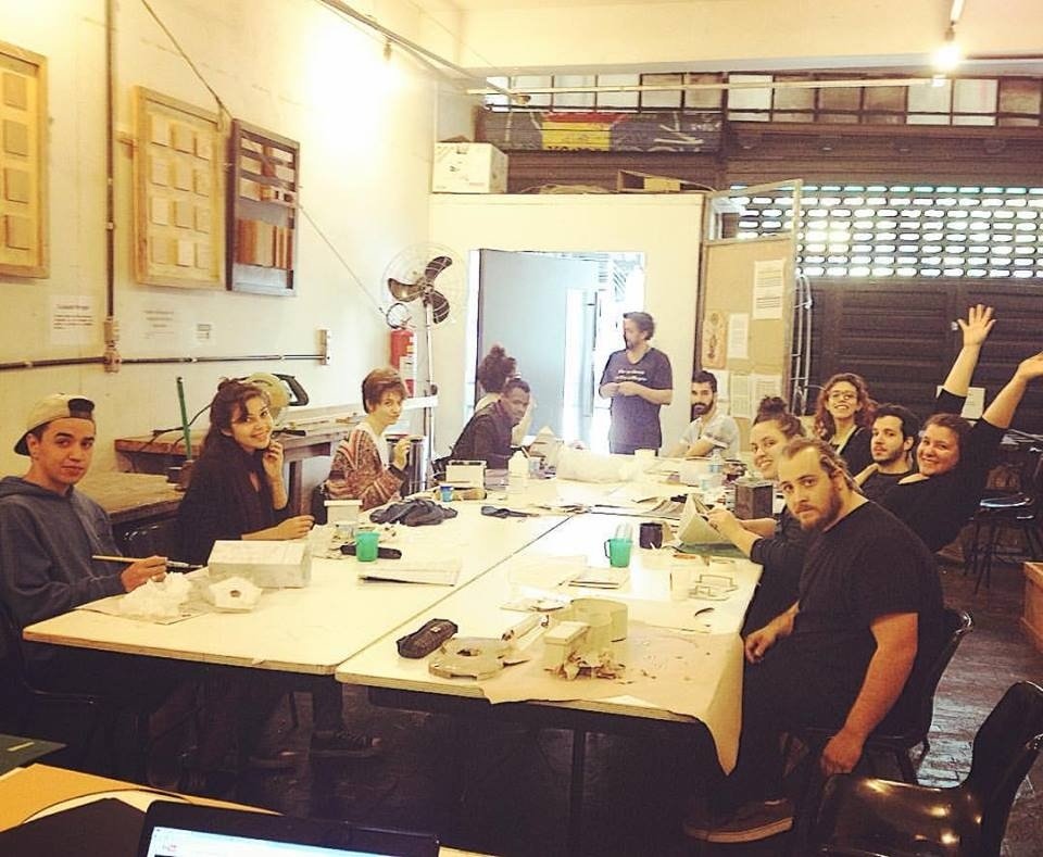 Aprendizes do curso regular de Técnicas de Palco em produção de objetos cênicos no ateliê da SP Escola de Teatro