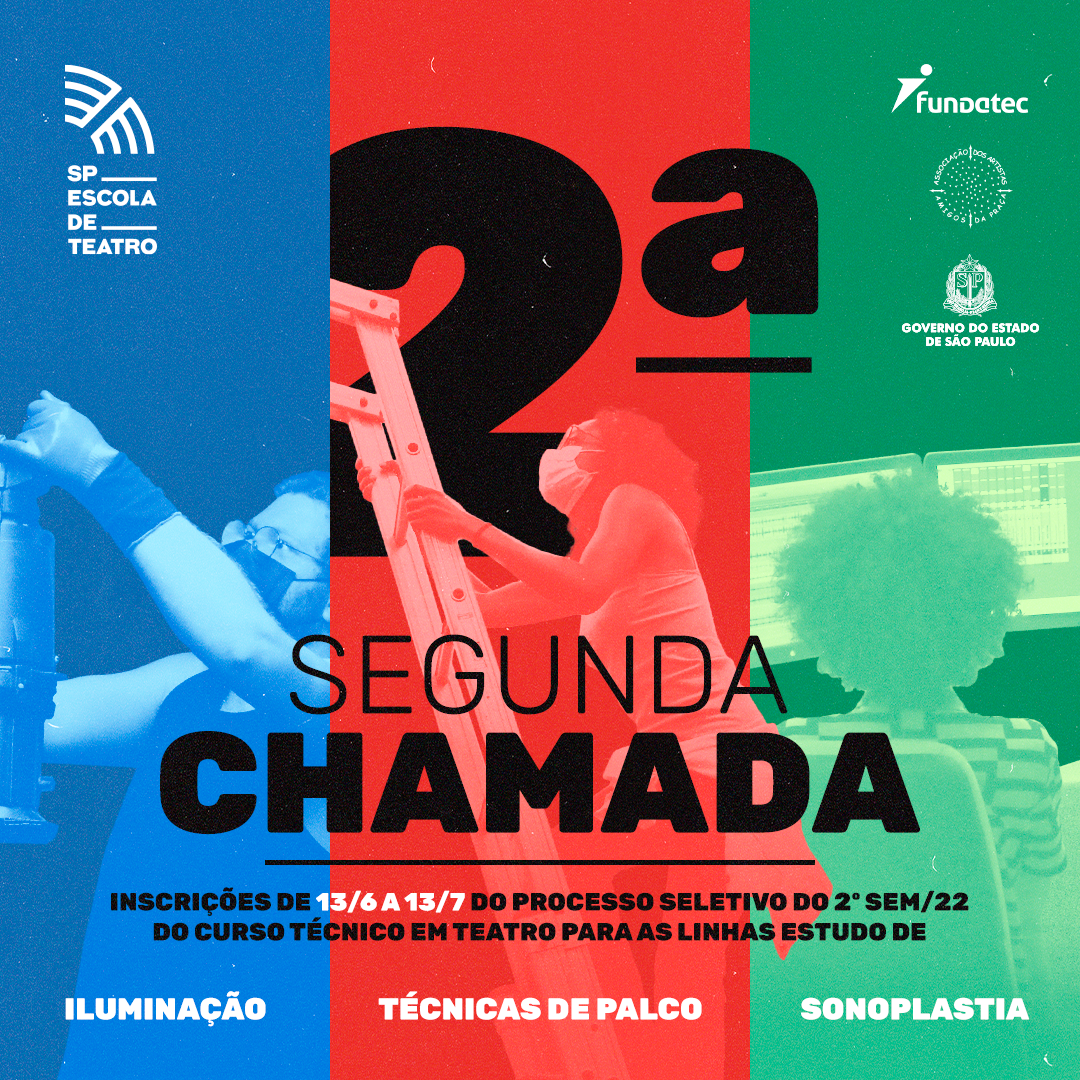 Nesta quarta-feira, 13, às 17h, acaba o prazo das inscrições, prorrogadas pela SP Escola de Teatro, instituição da Secretaria de Cultura e Economia Criativa do Estado e gerida pela Associação dos Artistas Amigos da Praça (Adaap), no processo seletivo das turmas do curso técnico em teatro, nas linhas de estudo de Iluminação, Sonoplastia e Técnicas de Palco. As inscrições podem ser feitas exclusivamente pelo site da Fundatec.
