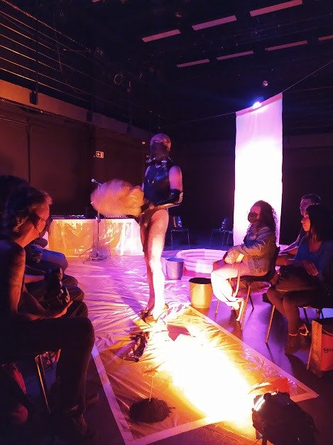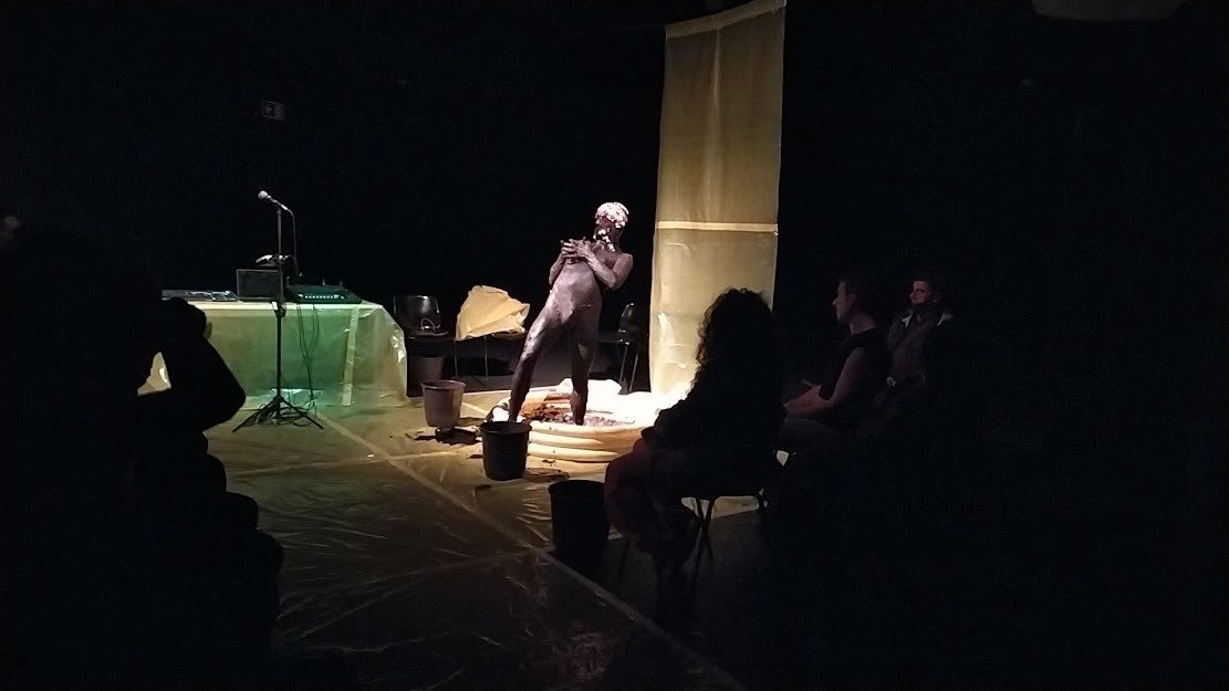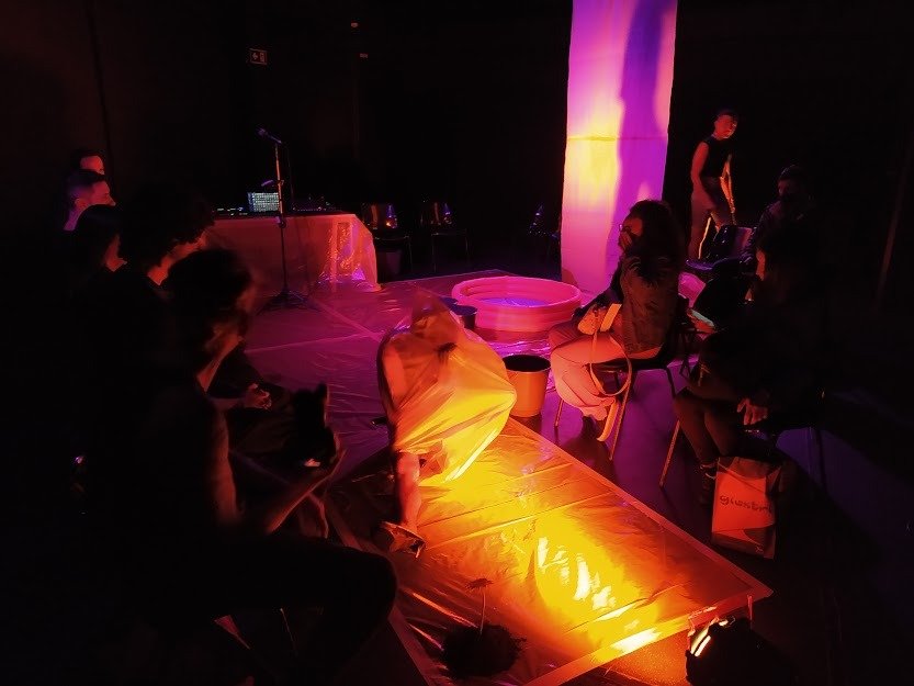 O último evento da residência foi a apresentação do espetáculo Lama, que desafiou e surpreendeu o público com a originalidade de sua temática. Com a premissa “Ponha as mãos na lama, nesta terra arrastada que nos prometemos”, o autor chamou os espectadores para participar desse processo de se enlamear, atentando para a possibilidade inusitada de encontrar um mote criativo nessa atitude: ‘Seja sujo, doente, imundo, nojento, forme figuras com esse curso atormentado. A lama como a sujeira que amamos. Como um deleite para a criação.’